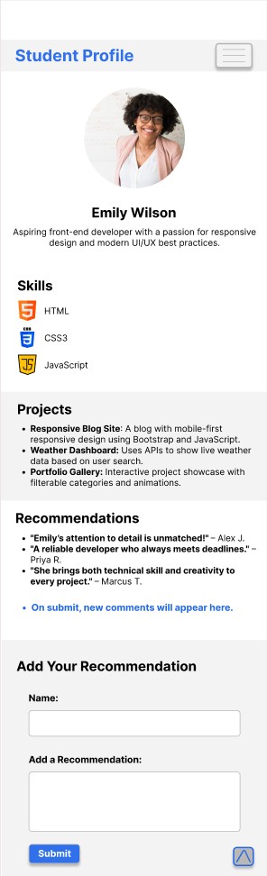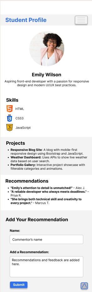 Develop a responsive, accessible profile page with an embedded form that allows students and faculty to recommend each other after campus projects, volunteer work, and event participation. It required a simple, adaptive layout to make it easy for users of all abilities to contribute.